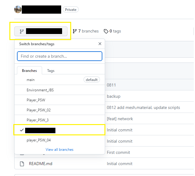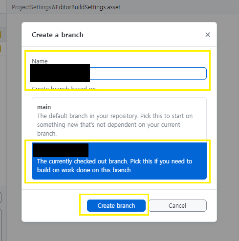 2. Create a branch > 이름 지정 > 최신상태로 만들고 싶은 branch 선택